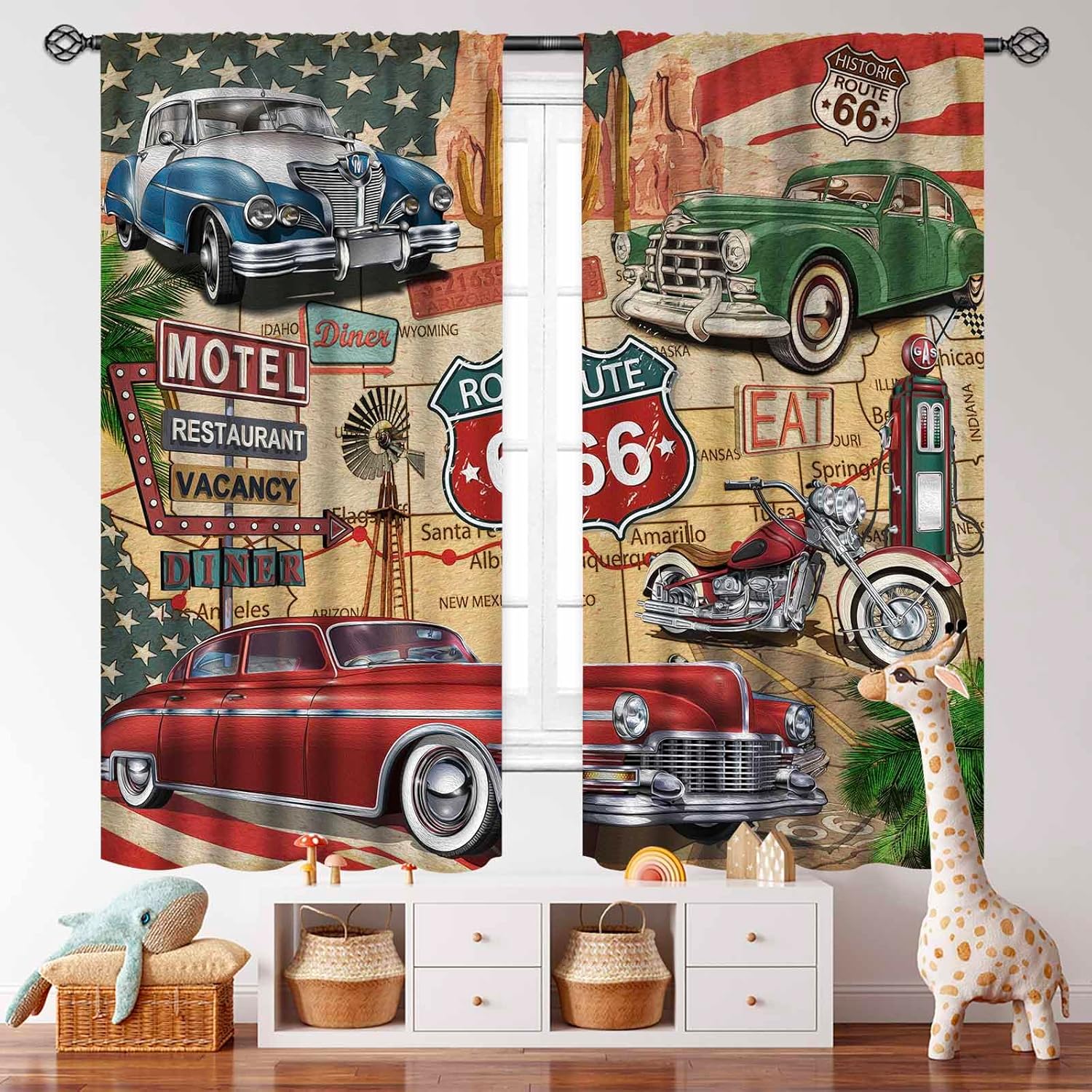Antique Cars Curtains,1950s License Plate Garage Poster Retro Country American Repair Vintage Nostalgic Letter Man Cave Vintage Bar Drapes Treatments for Bedroom Living Room 2 Panels,52X84 Inch