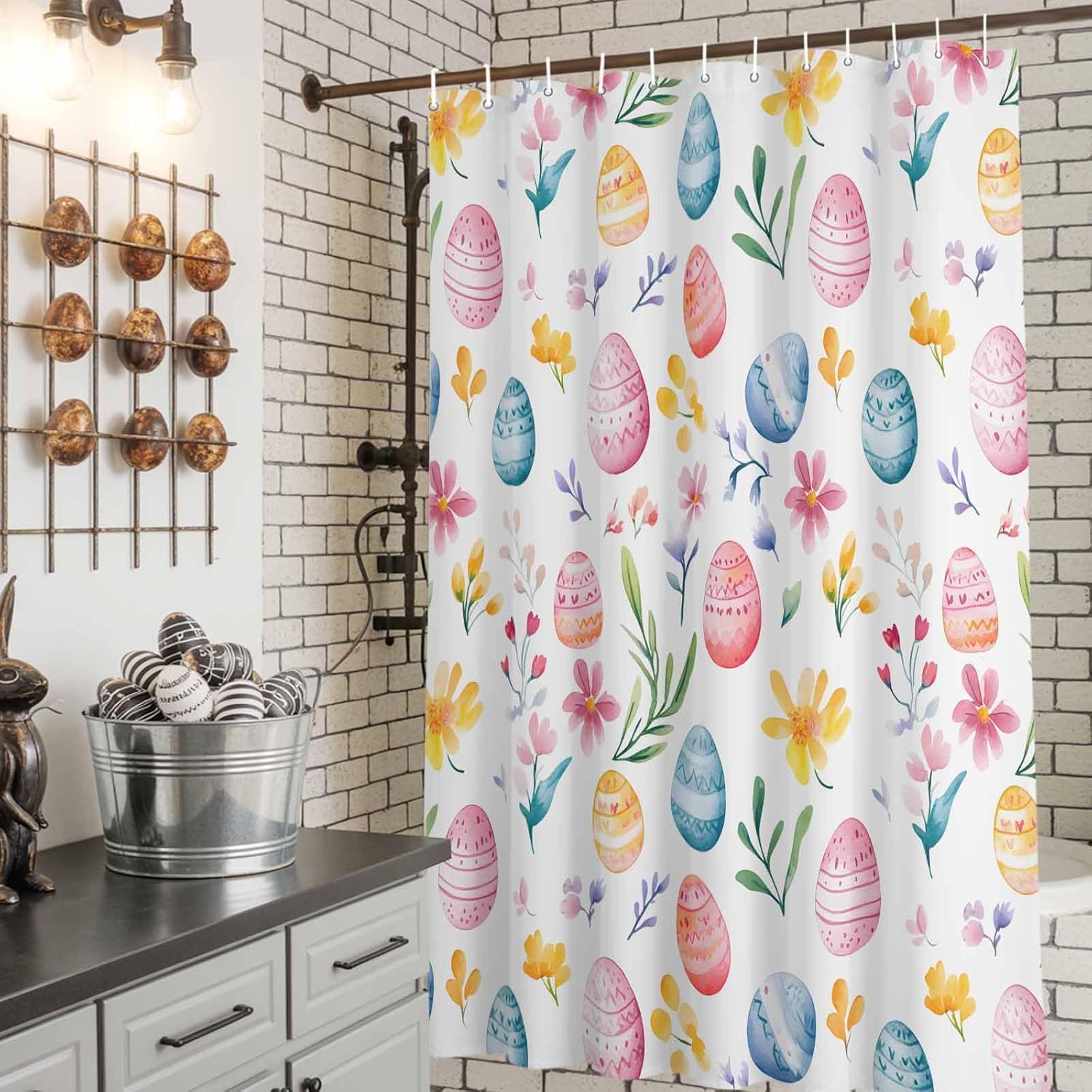 • Easter Bathroom Decorations: This bathroom curtain with bold printed graphics adds a vibrant and crisp test to brighten your bathroom up. The lightweight cloth shower curtain provides perfect privacy and Easter appeal