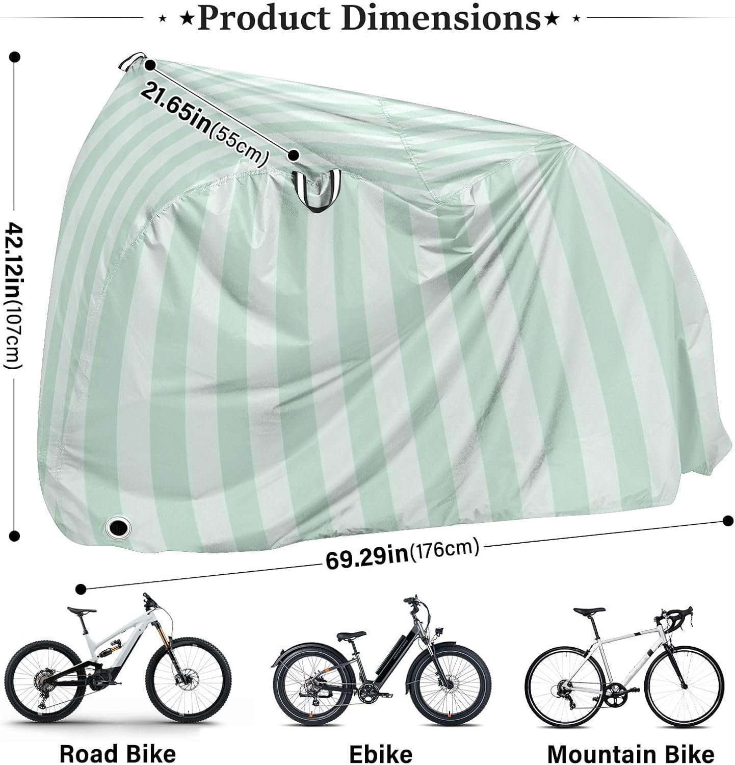 Bike Covers Outdoor Dimensions: 176*107*55cm/69*42*21.6Inches. Please note that this lid is for 1 and does not include two bicycles. Please measure the size before placing an order.Material: Umbrella waterproof fabric. Made of umbrella waterproof fabric, Bike Covers Outdoor is sun-proof, dust-proof and water-repellent.Product Functions: Outdoor Bike Cover can effectively physically cool down, block direct ultraviolet rays, and has excellent shading, heat insulation and sun protection effects. Rainy days can prevent the car body from getting wet by rainwater.Safety & Anti-theft: Lock holes are reserved at the front wheel position and lock buckles at the rear wheel position to prevent wind dissipation, making it convenient to use and achieving an anti-theft effect. Covers for Bike is convenient to use and can be easily folded into a portable size. When not in use, it can be put into a storage bag.Outdoor Accessories: This Bike Cover provides a protective guarantee for your beloved car and is an essential accessory for outdoor camping. It can also be given as a present to your fellow colleagues and friends.