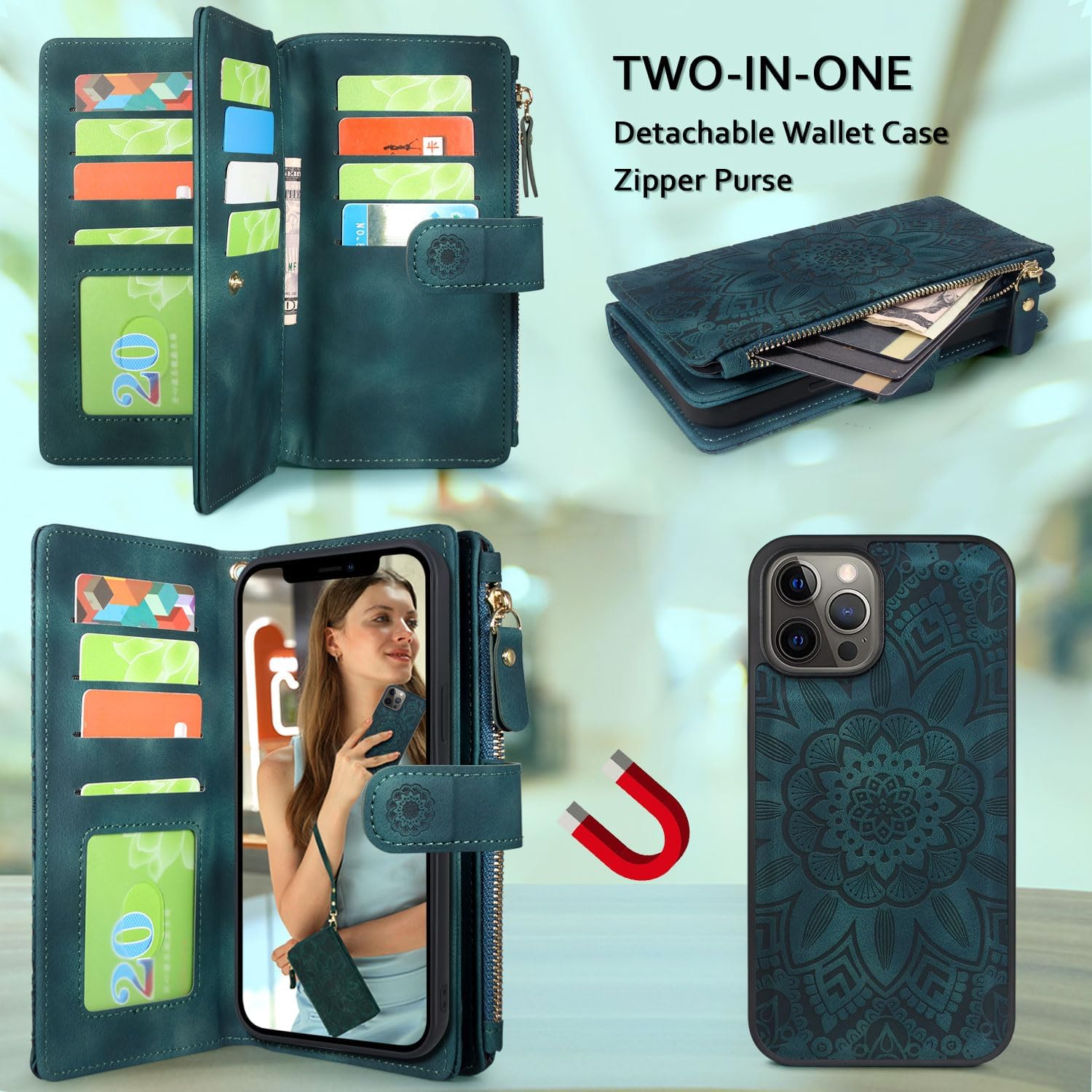 Compatible with iPhone 12 Pro Max 6.7 inch 2020 Features: 1.Detachable magnetic case cover, you can take the phone off from the wallet part easily. Removable shockproof tpu+pc back case, keeps your phone safe from accidental drops. 2.With 12 card slots holder and zipper pocket, you can put 12 cards ,money cash,coin,paper receipts,driver's license,key,usb cable or earphone or other small thing. 3.With wrist strap, you can hold it in your hand or wrist when busy carrying something. 4.Strong magnetic clasp closure, keep your phone more secure in the wallet. 5.Stylish color and functional elegent design would work well for men or women.Good choice as a gift. Package Include: 1* Wallet Case & 1* Wrist Strap from Harryshell