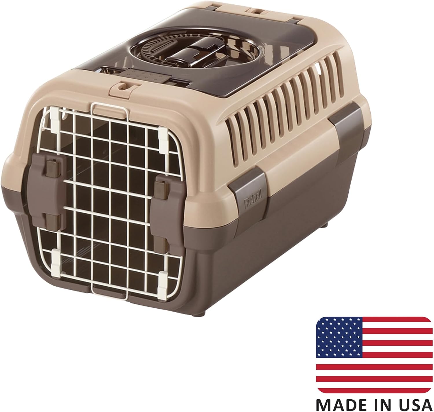 DOUBLE DOOR CARRIER: SMALL - BROWN - Richell’s Double Door Pet Carrier is the best solution for taking pets along for a trip. Gone are the days when pet carriers had nearly all the same features and colors. This Cat/Dog Carrier includes a clear top door that opens outward and allows for easy loading of your cat or dog. It also includes a removable front door that opens to both right and left sides. The top and base are attached with 4 latches for easy assembly. The carrier can be used with a car seat belt to keep your pet safe and secure while in a moving vehicle. It is even stackable for convenient storage that takes up minimal space in your home. Small size for dogs and cats up to 11 lbs. Inside the carrier: (Small) 11 x 16.7 x 9.6”H. Top door opening: (Small) 8.7 x 9.1”. Side door opening: (Small) 7.9 x 10.2”.