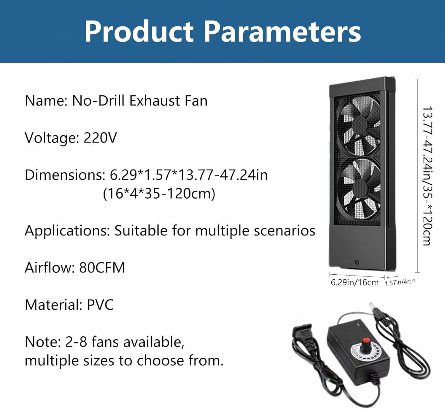 In today’s fast‑paced life, urban residents long for a fresh, comfortable home environment.Window Exhaust Fan suitable for bathrooms, kitchens and bedrooms, it works as an invisible home air steward: powerfully extracting stale air, filtering impurities, and quickly dissipating summer heat.It keeps every room comfortably cool and fresh at all times.Name: Window Exhaust FanVoltage: 220VDimensions: 6.29*1.57*13.77-47.24in/16*4*35-120cmCurrent: 0.35AApplications: Suitable for multiple scenariosAirflow: 80CFMMaterial: PVCPackage Contents:Window Exhaust Fan * 1Power Adapter * 1Voltage Converter * 1